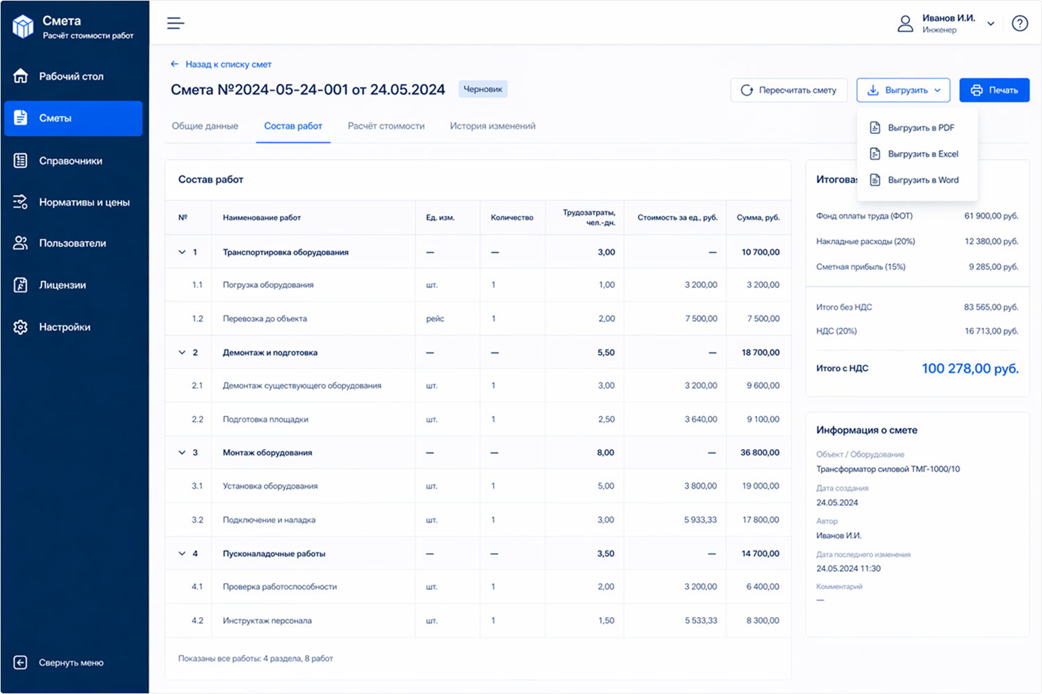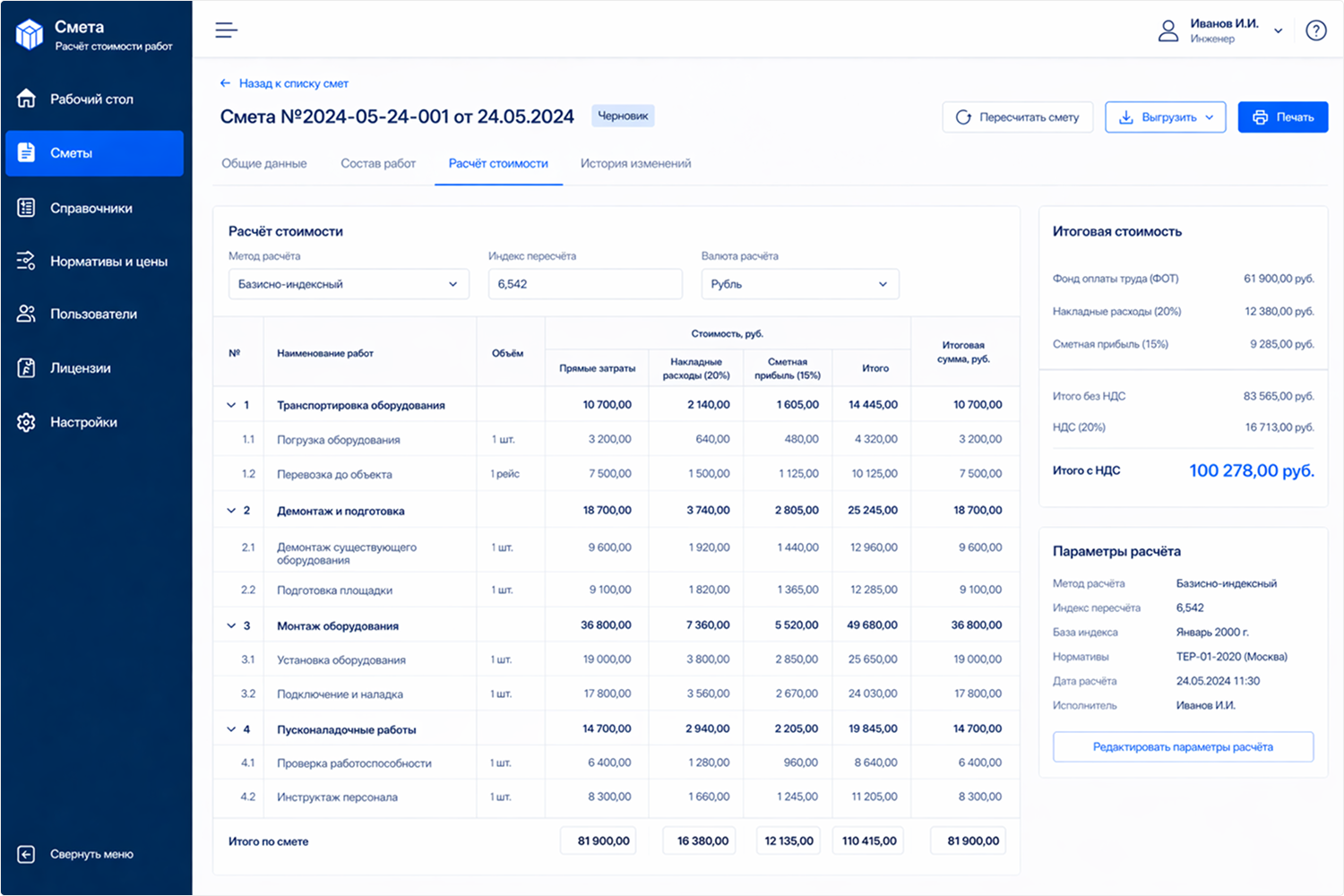 - Обеспечили единый стандарт смет и прозрачность изменений: видно, кто и как формировал расчёты.
