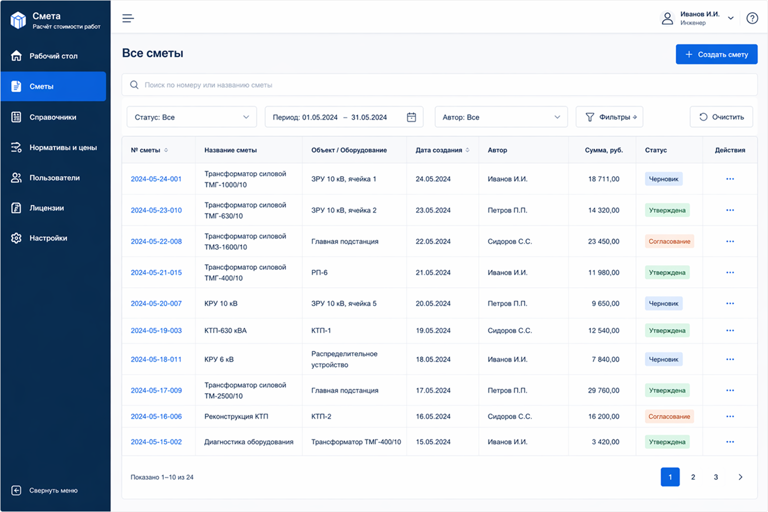 А также фиксирует автора каждой сметы и дату последнего изменения.